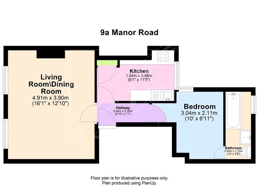 The accommodation comprises a front-facing lounge/diner, a fitted kitchen with appliances, and a bedroom and bathroom positioned to the rear. The property is neutrally decorated throughout.