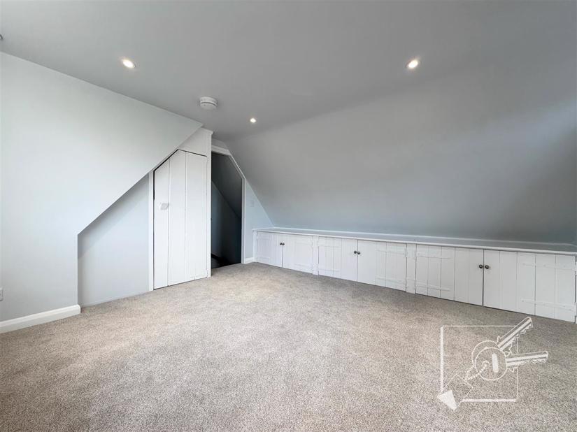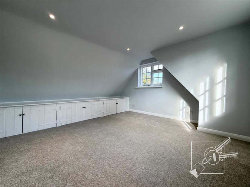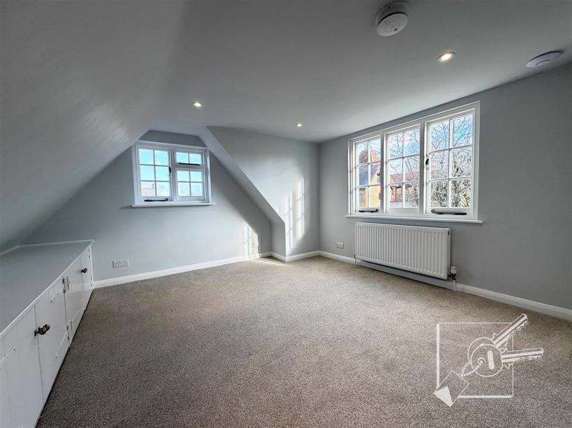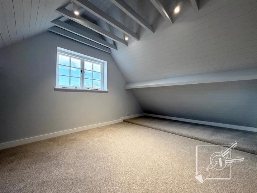 Upstairs, there is a large landing, a bathroom, and a double bedroom. Further stairs lead to the second floor, which offers a second double bedroom.