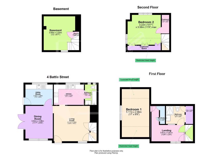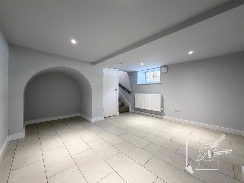 The ground floor comprises a living room with a log burner fireplace, an additional reception room, kitchen, utility room, and downstairs bathroom. There are also stairs leading down to a basement room.