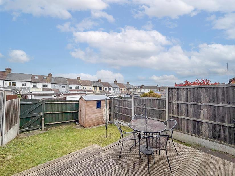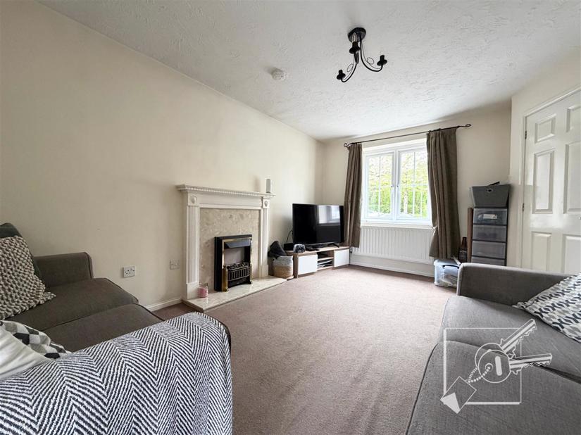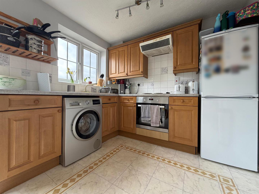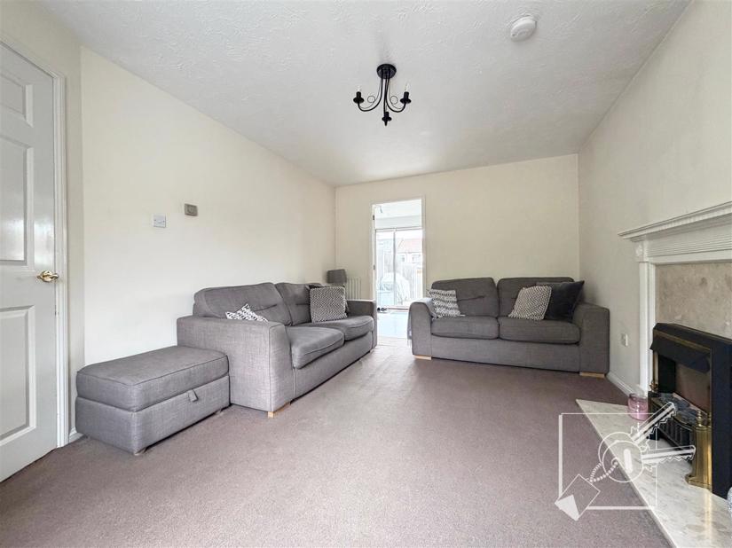 The property features a welcoming living room that flows seamlessly into the kitchen, which benefits from patio doors opening out to the garden.