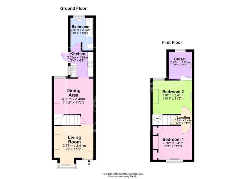 The ground floor has a living room leading into a separate dining room, with the kitchen at the back. The bathroom is also located to the rear.