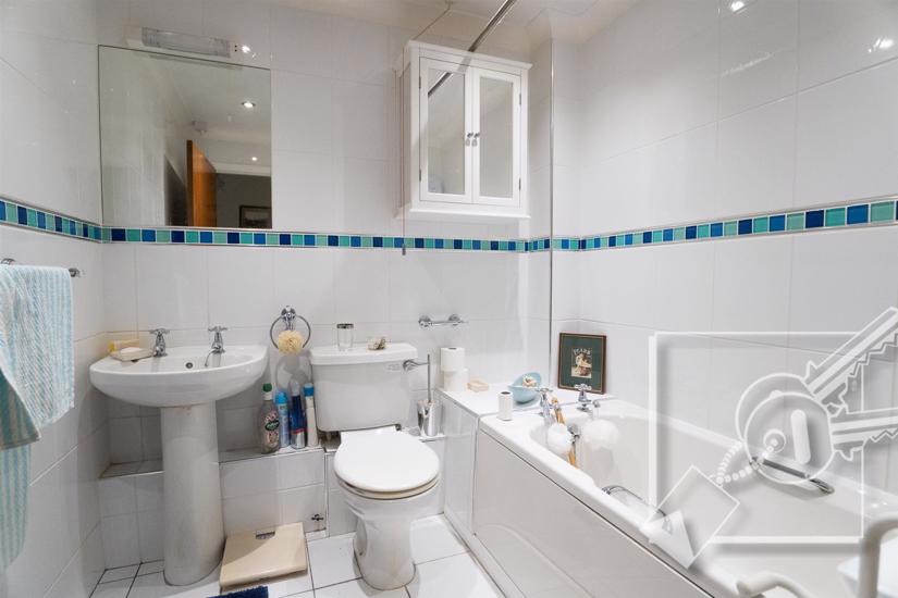 White suite comprising panelled bath, pedestal wash basin and low level w.c. Tiled walls, tiled floor, shaver light point.
