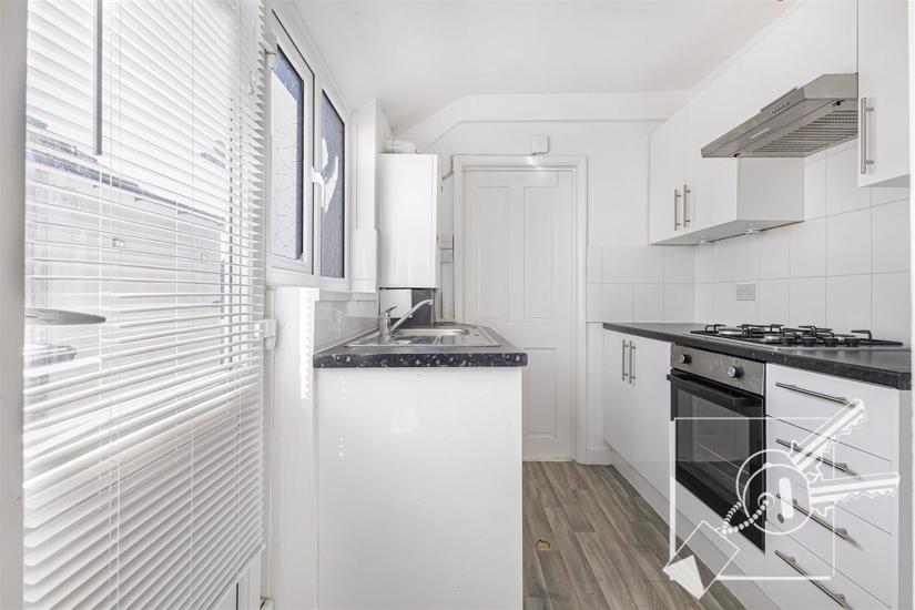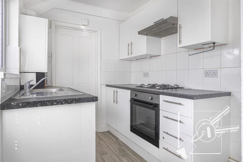 Double glazed window, double glazed door to garden. Vinyl flooring, Vaillant combination boiler for hot water and central heating. Fitted with white gloss wall and base cupboards, stainless steel sink and drainer, work surfaces, "Lamona" Gas Hob with matching oven and extractor hood.