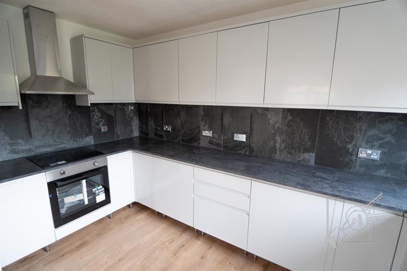 Double glazed window to side. Newly fitted wall and base units, complimentary work tops, round stainless steel sink and drainer, Built in oven, hob and extractor. Plumbed for washing machine. contemporary local tiling to walls.