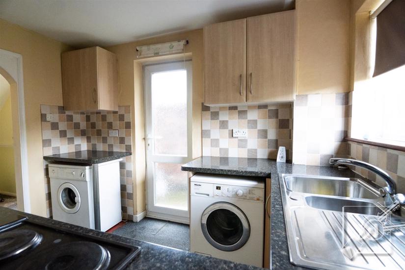 Carpet tile flooring. Beech effect wall and base cupboards and black marble effect worksurface. One and a half stainless steel sink with drainer. Space for fridge freezer and washing machine. Double glazed window to rear and upvc door leading to rear garden. Neff built in double oven. Built in electric hob. Serving hatch through to lounge/diner. Localised tiling on the walls.