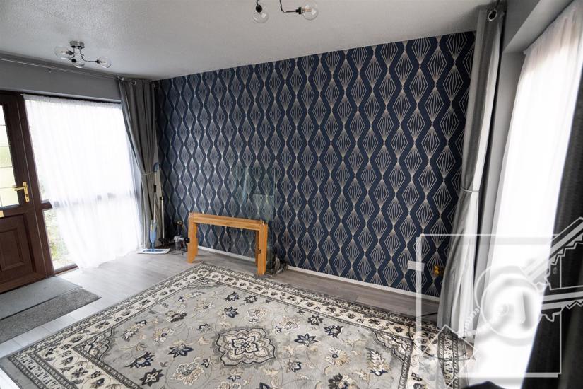 An L shaped room with double glazed picture window to front over looking the front gardens and double glazed patio doors leading out to the rear courtyard. Two radiators, grey laminate floor. Space for lounge furniture and small dining table. under stair storage cupboard Access to kitchen.