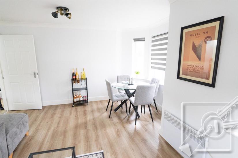 A bright and spacious double aspect room with double glazed bay window to front, further double glazed window to front and double glazed window to side, wall mounted electric heater, laminate flooring. There is plenty of space for lounge and dining furniture.