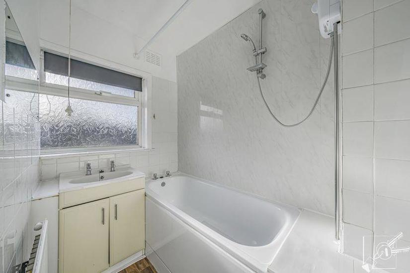 Double glazed window to rear, panelled bath with shower over and Aqua boards, vanity wash basin, part tiled walls.