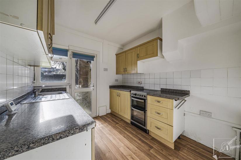 Double glazed window and door to rear. Fitted wall and base cupboards. plumbed for washing machine, freestanding cooker, stainless steel sink and drainer. Part tiled walls.