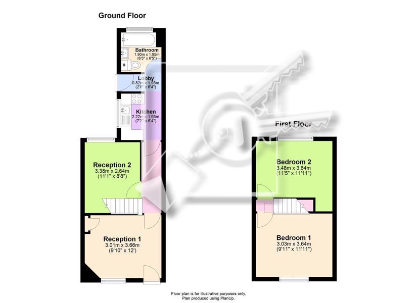 Created by a stud partition. Laminate flooring. Access to staircase, reception 2 and kitchen.