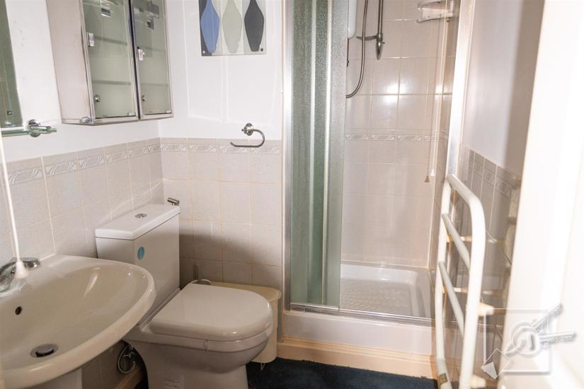 White suite comprising shower cubicle, wash basin and low level w.c. Tiled walls, electric heated towel rail, extractor fan, medicine cabinet.
