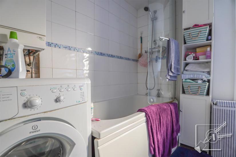 Double glazed window to side. White suite comprising panelled bath with shower over and glass screen, low level w.c., pedestal wash basin. Radiator, tiled splashbacks, tiled floor. Wall mounted "Main" Combi boiler.
