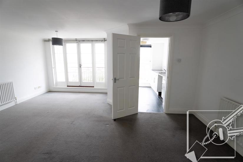 A bright and spacious room with plenty of space for both lounge and dining furniture. Double glazed double doors leading out onto balcony with tremendous views over the Gordon Promenade, River Thames and Fort Gardens. carpet, two radiators, access to kitchen: