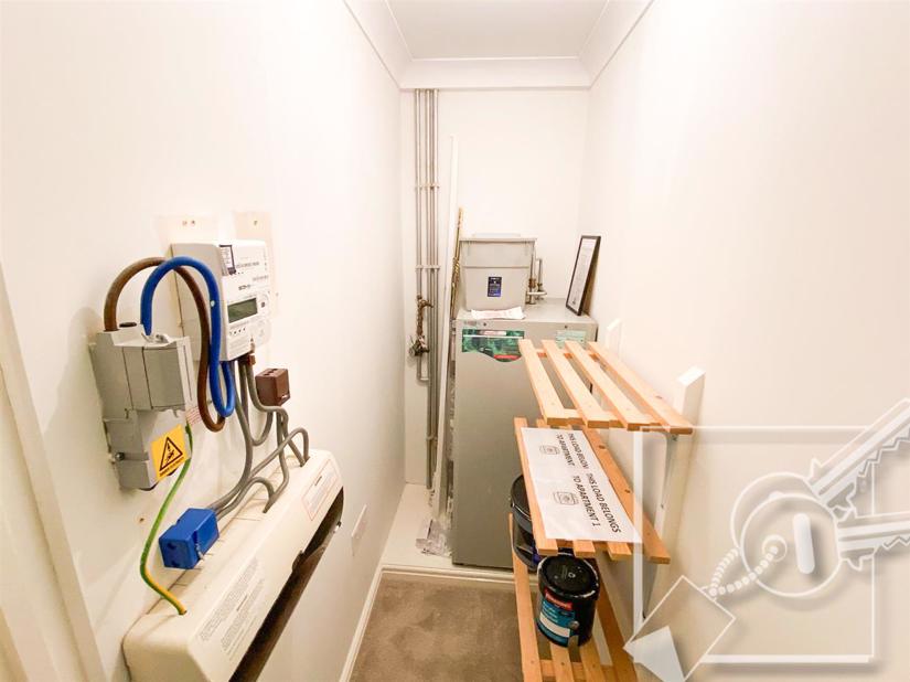 A large storage cupboard housing consumer unit and electricity meter and providing excellent storage.
