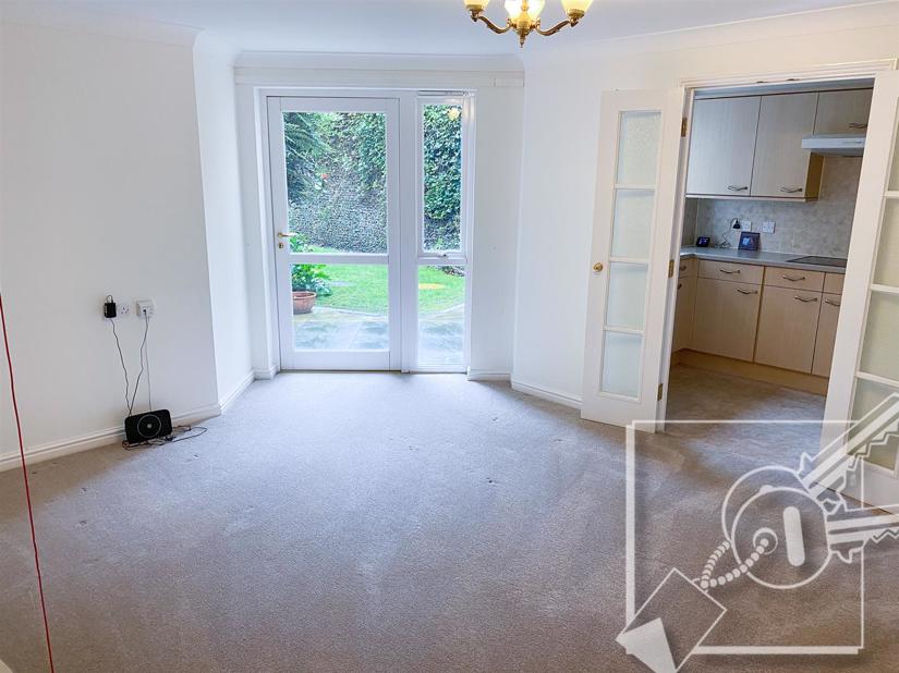 Carpet as laid, single door with window to side leading onto the patio area. Two glazed georgian style doors leading to the kitchen. Ornamental fireplace.