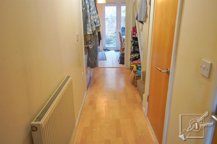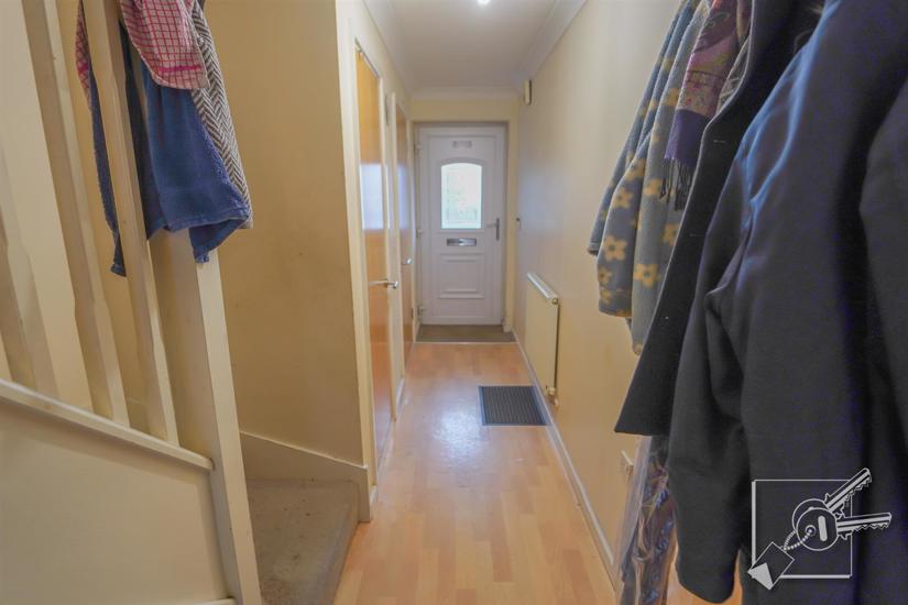 Front door leading into hall with laminate floor, radiator, large built in storage cupboard. Access to garage, cloakroom and kitchen/diner.
