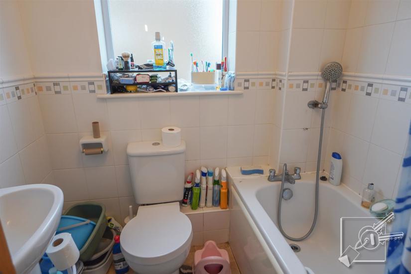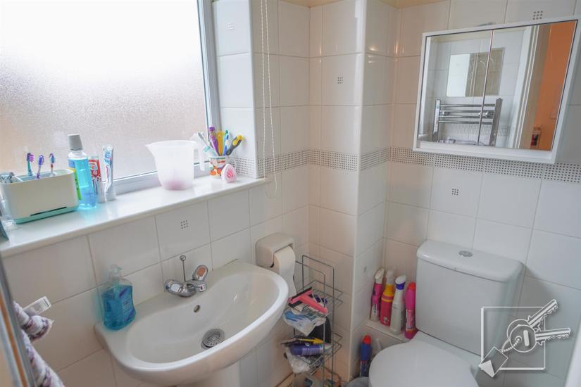 Double glazed window to rear. White suite comprising panelled bath with shower over, pedestal wash basin, low level w.c., heated towel rail, tiled floor. partially tiled walls.