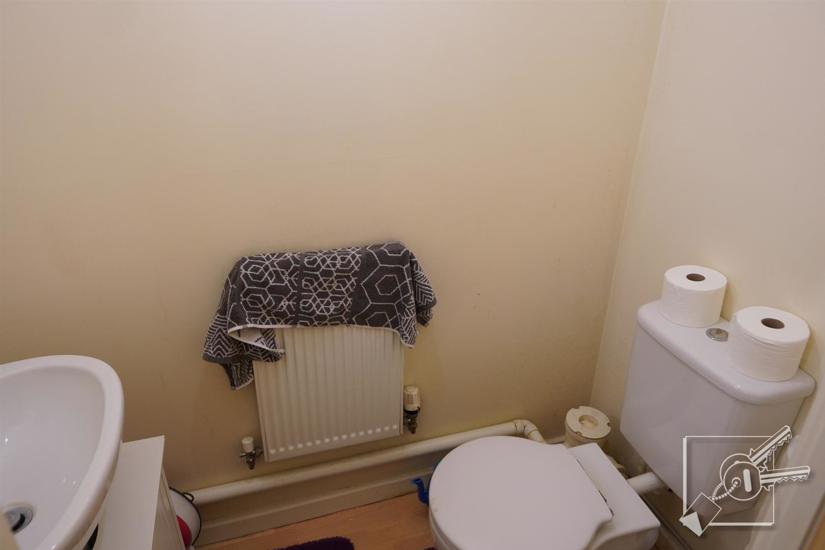 White suite consisting low level w.c., pedestal wash basin, radiator, extractor fan, laminate floor.