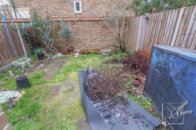 The rear garden is fully enclosed with paved patio, grass area, brick wall and fencing. Outside light.