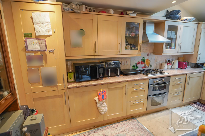 An L shaped room with double glazed doors from dining area leading out to rear garden, tiled flooring, radiator. The kitchen area is fitted with maple effect wall and base units. two deep pan drawers, rolled edge work surfaces, inset stainless steel one and a half bowl sink and drainer, inset gas hob with extractor hood above, electric double oven, integrated dishwasher, washing machine and fridge/freezer. Double glazed window to rear from kitchen area.