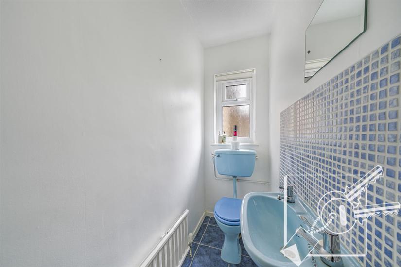 Double glazed window to side, sky blue suite comprising low level w.c, wash basin, radiator.