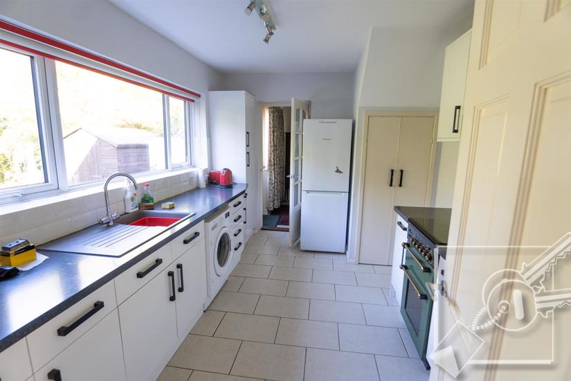 Double glazed window to rear, under stair cupboard, white wall and base cupboards. Plenty of work surfaces, sink and drainer, gas cooker point, plumbed for washing machine. Tiled floor, local tiling to walls, door to: