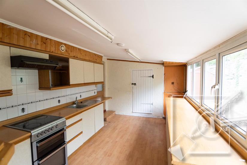 A large kitchen perfect for cooking and entertaining. UPVC door leading to driveway and garden. An array of floor and wall cupboards with matching worktop and upstand. Localised tiling. Stainless steel sink with drainer, extractor fan. Space for washing machine, oven and fridge freezer. Double glazed windows facing the rear of the property. Wood effect vinyl flooring. Door leading to: